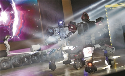 图为两个重达400公斤的大型机器人激烈碰撞格斗。